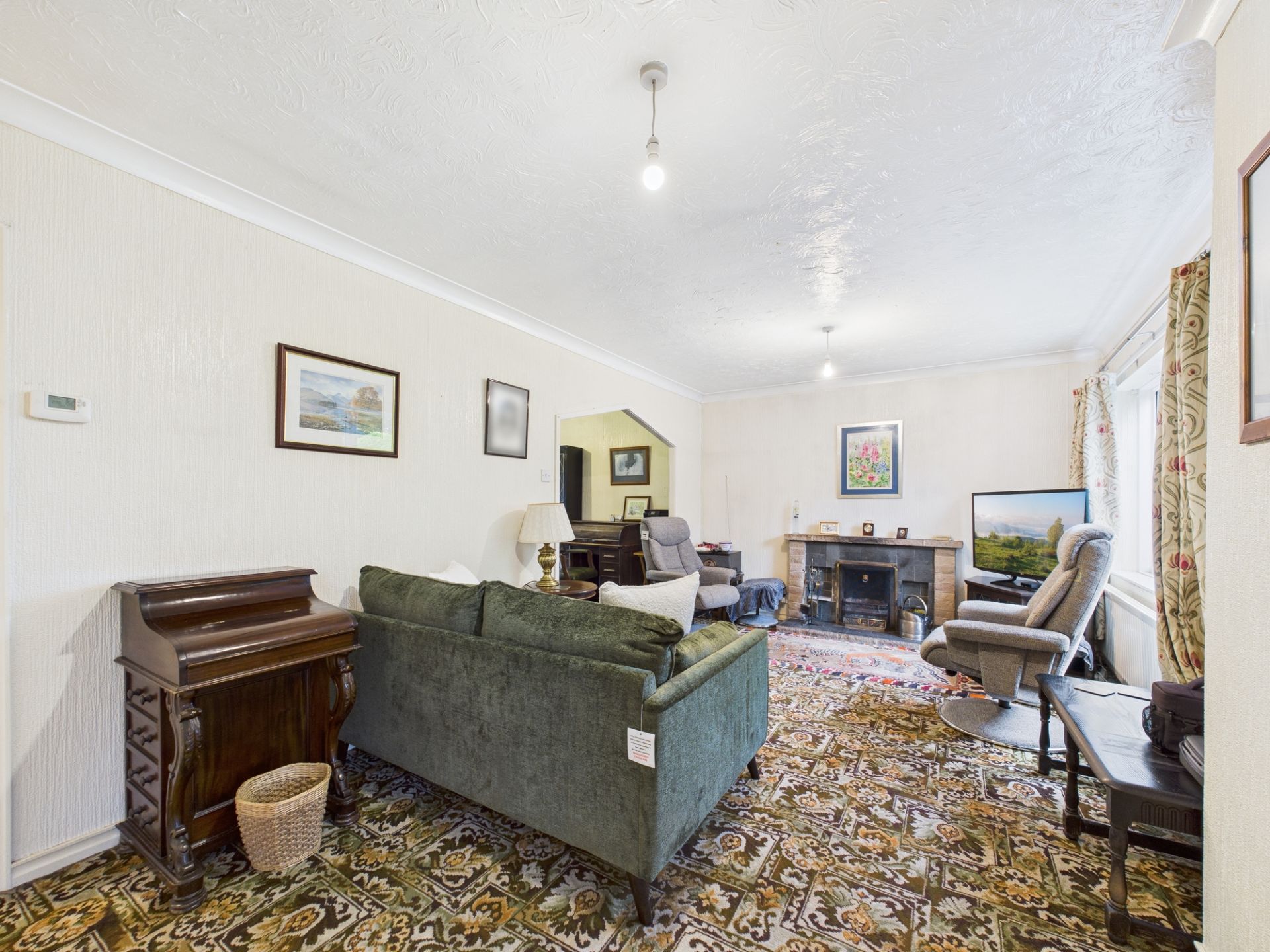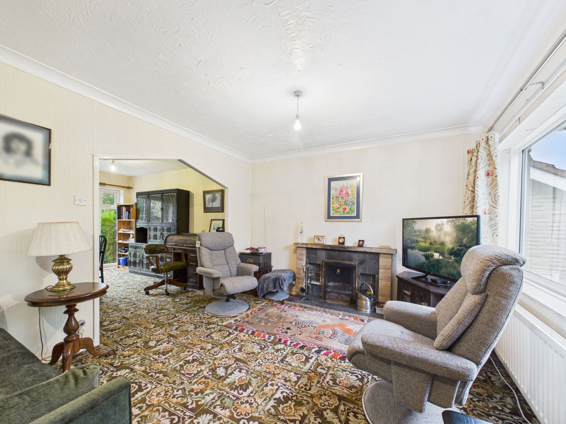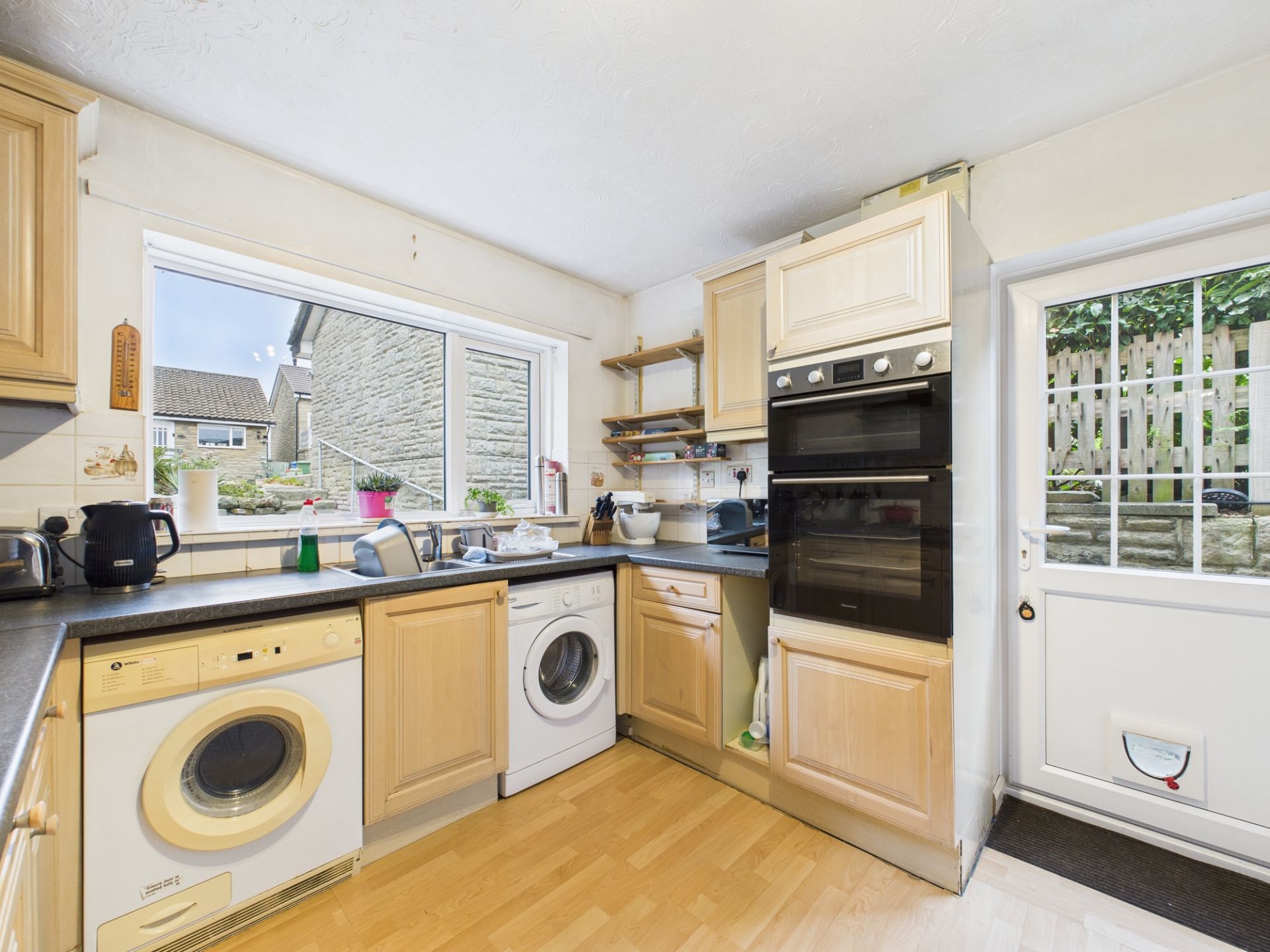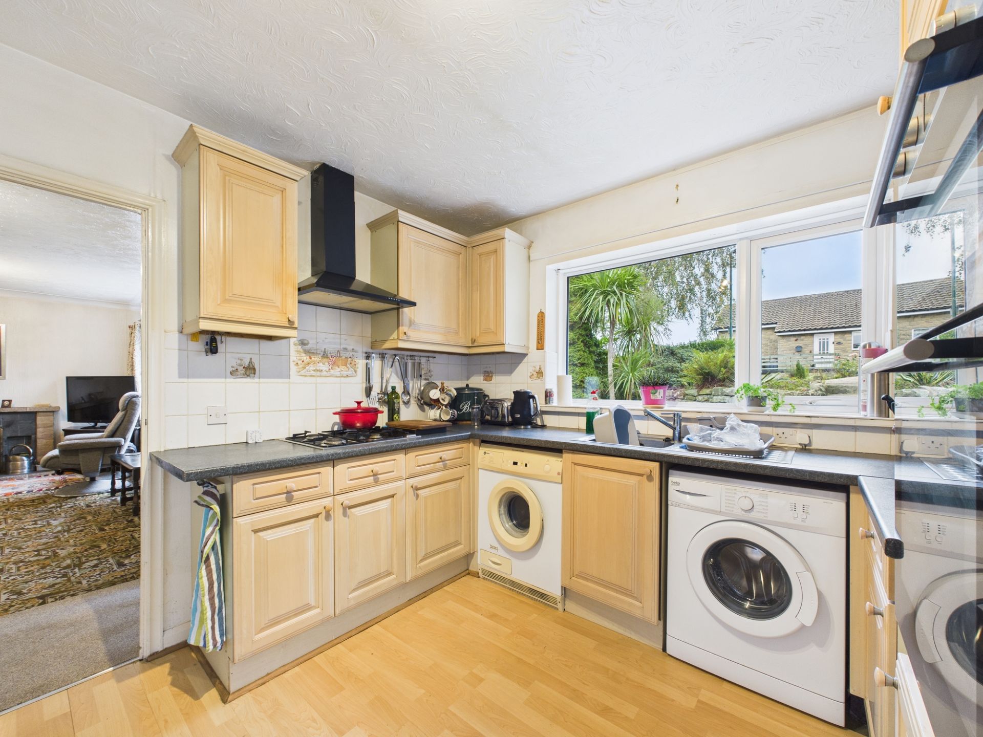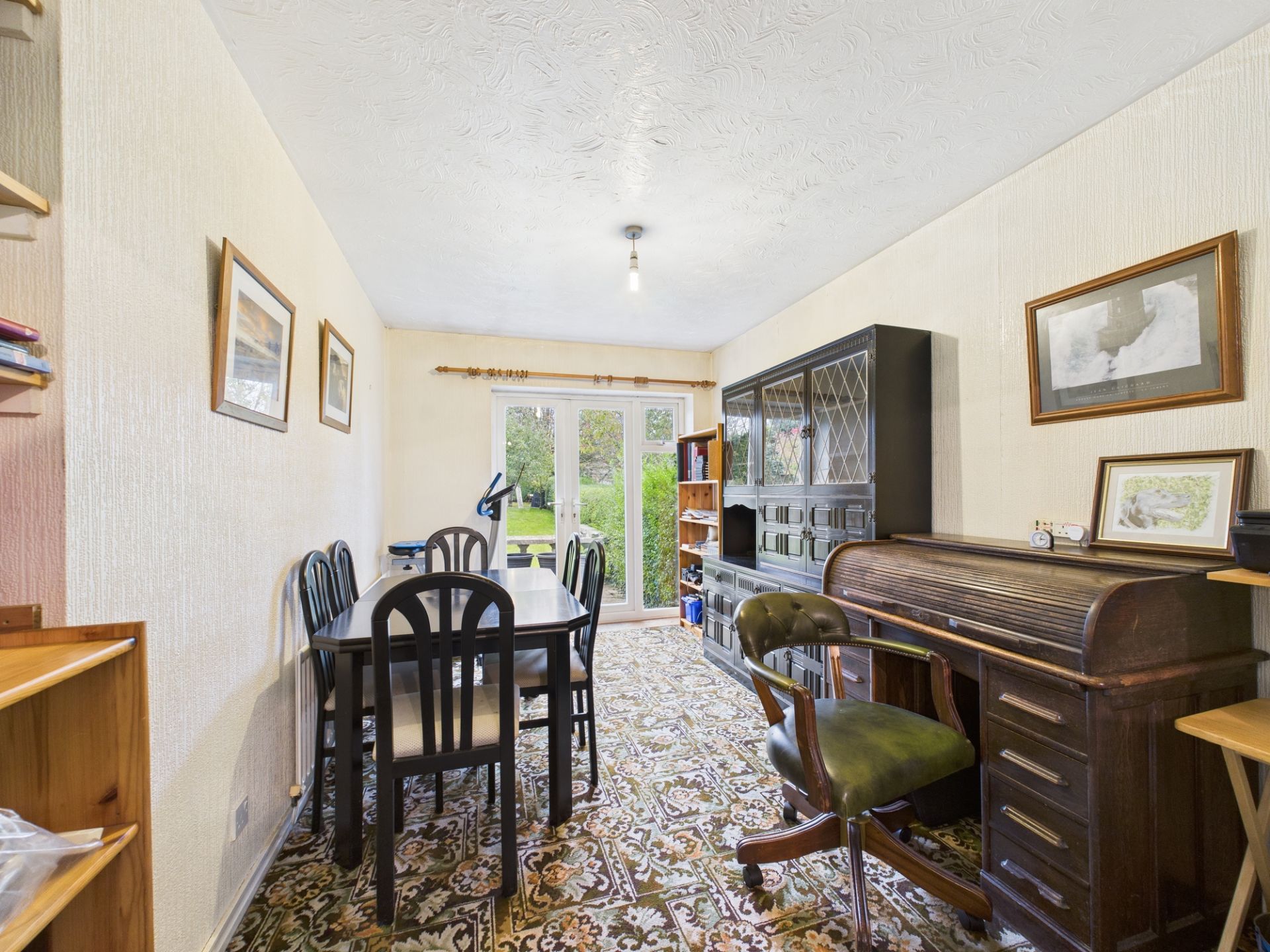 The accommodation offers an excellent foundation. The open-plan lounge/diner creates sociable living space, enhanced by French doors that frame views across the established gardens—a feature that will truly shine once brought to its full potential. The kitchen benefits from fitted cabinetry and an integrated oven and hob, providing functional groundwork for future enhancement.