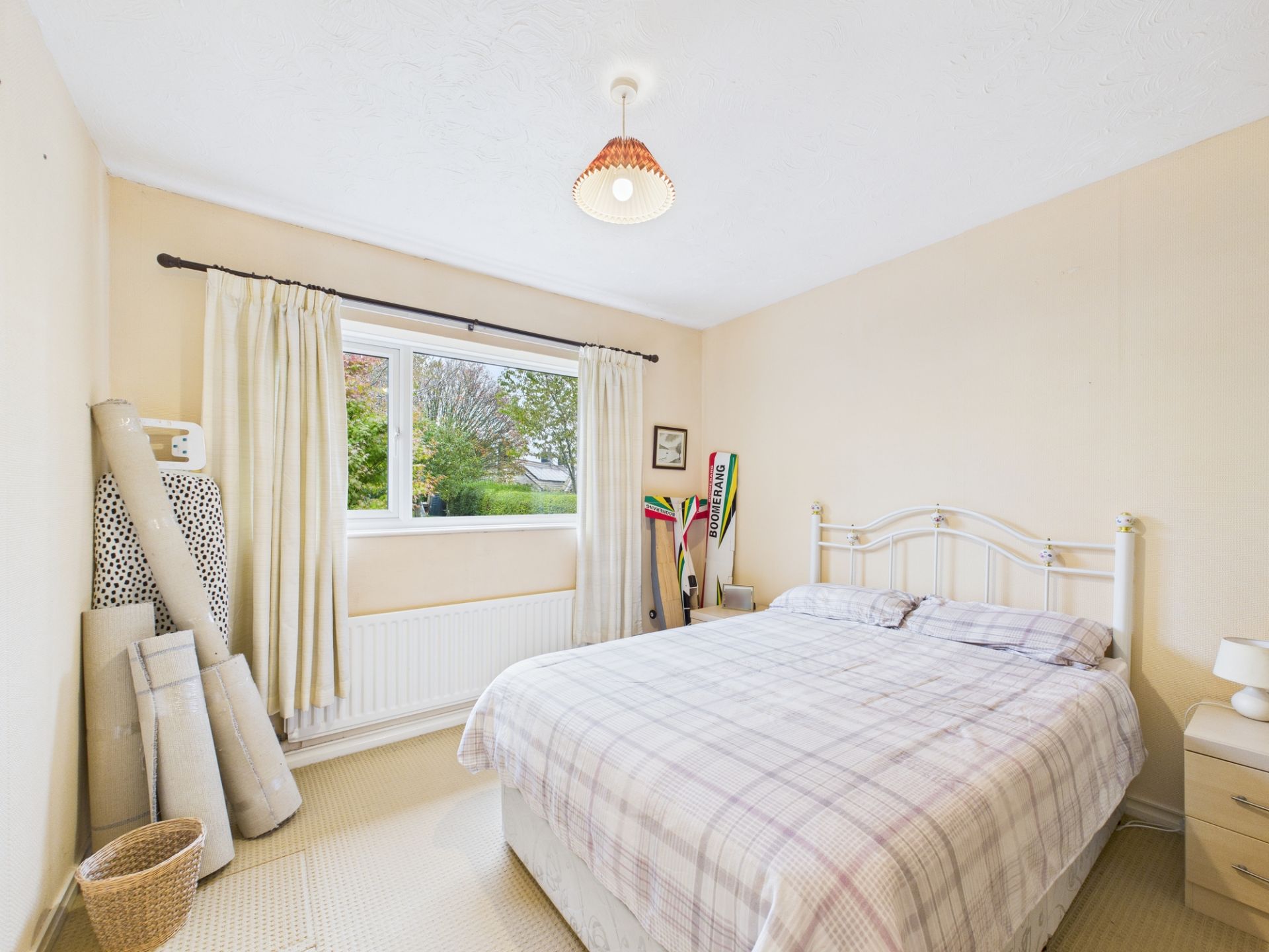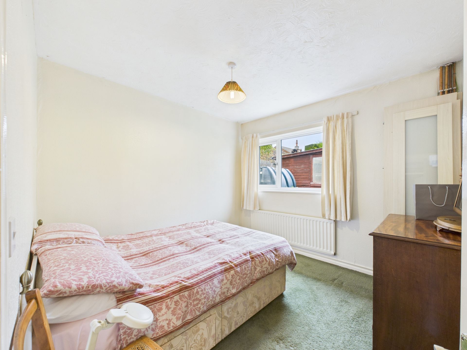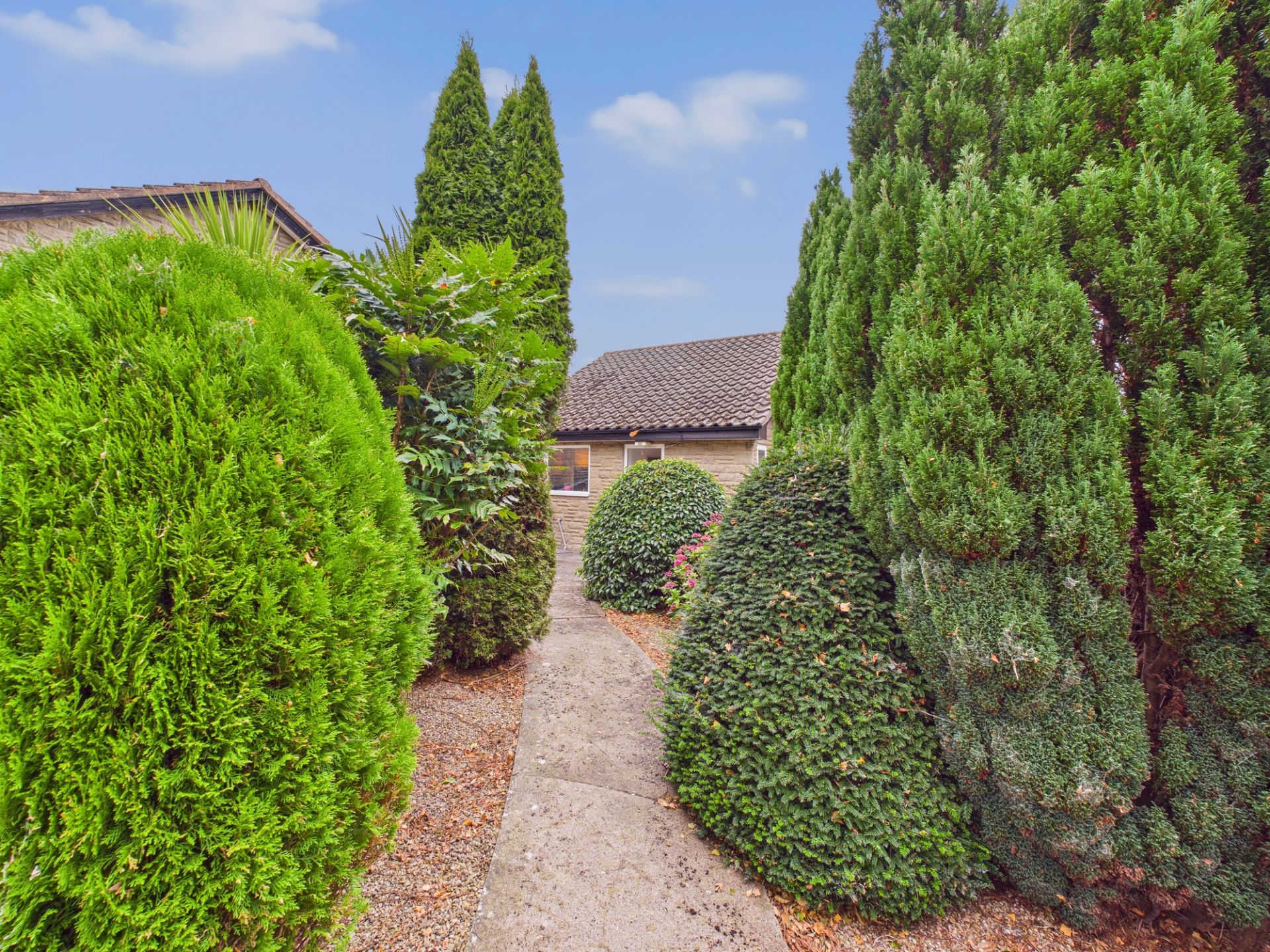 The single garage with a driveway addresses parking and storage needs, whilst the mature gardens to the front and rear offer ample outdoor space. The front garden has mature trees and shrubs with a level pathway through to the main entrance, whilst to the rear there is a long lawned area dotted with fruit trees and bordered by hedges.