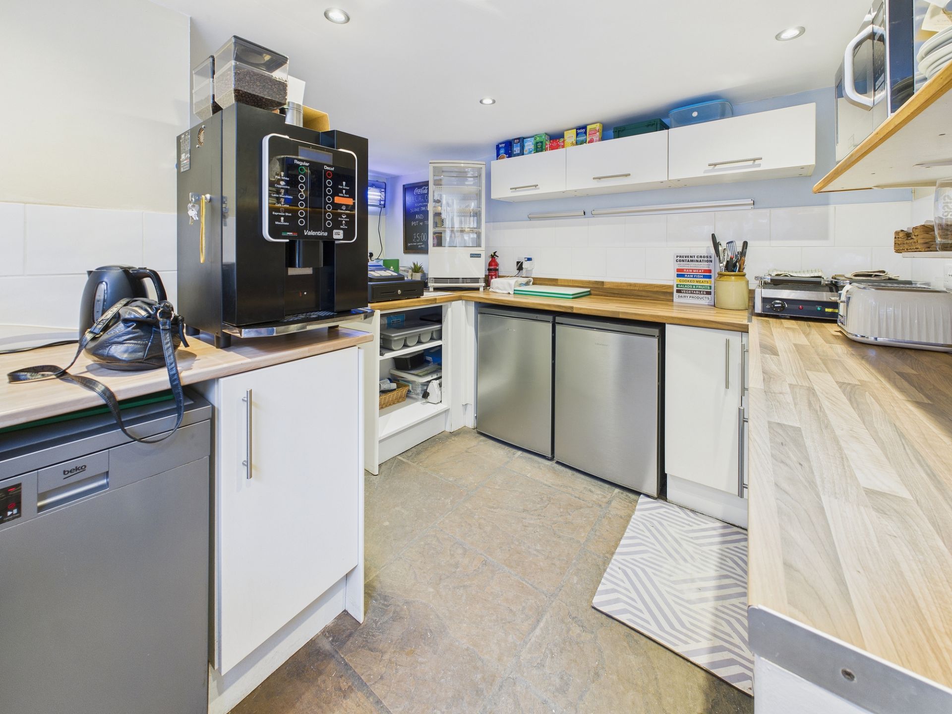 The commercial space comprises well-equipped kitchen facilities including coffee machine and panini maker, indoor seating accommodating fourteen covers, plus an additional six outdoor covers for alfresco dining. There is also a WC. The kitchen's comprehensive fit-out provides immediate operational capability.