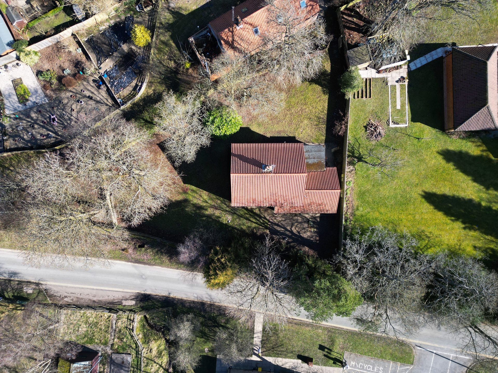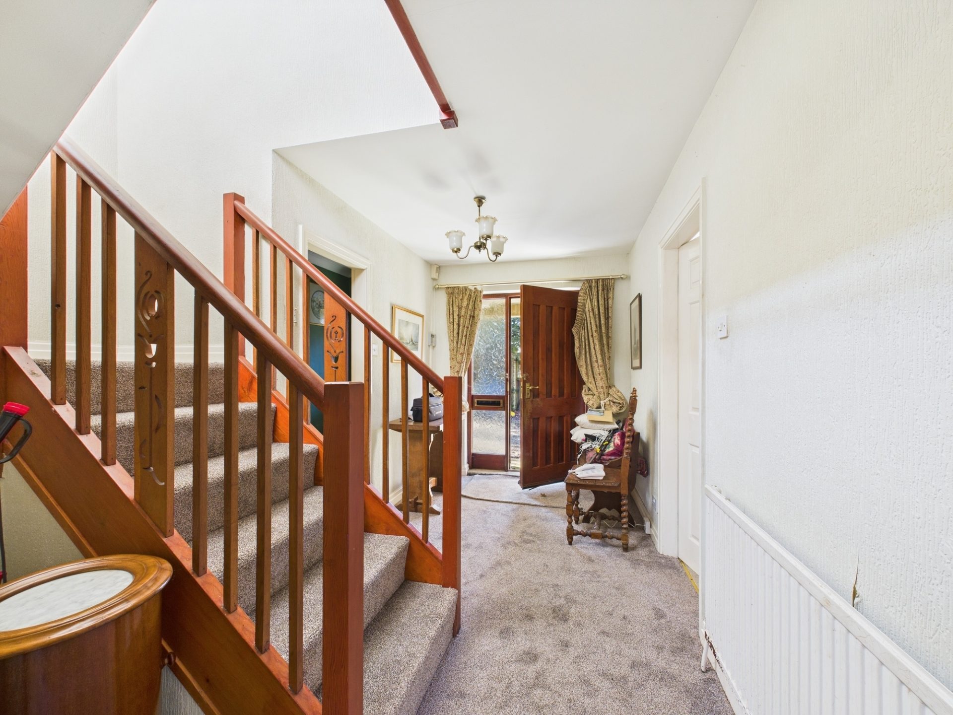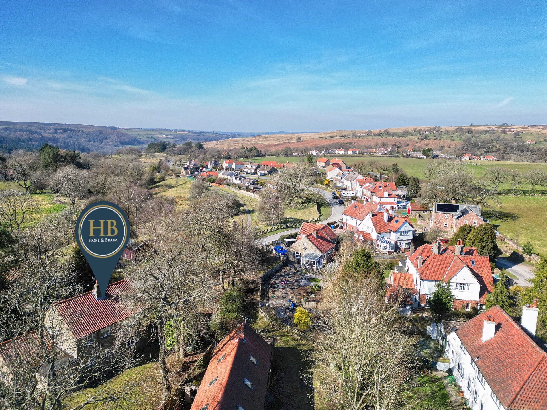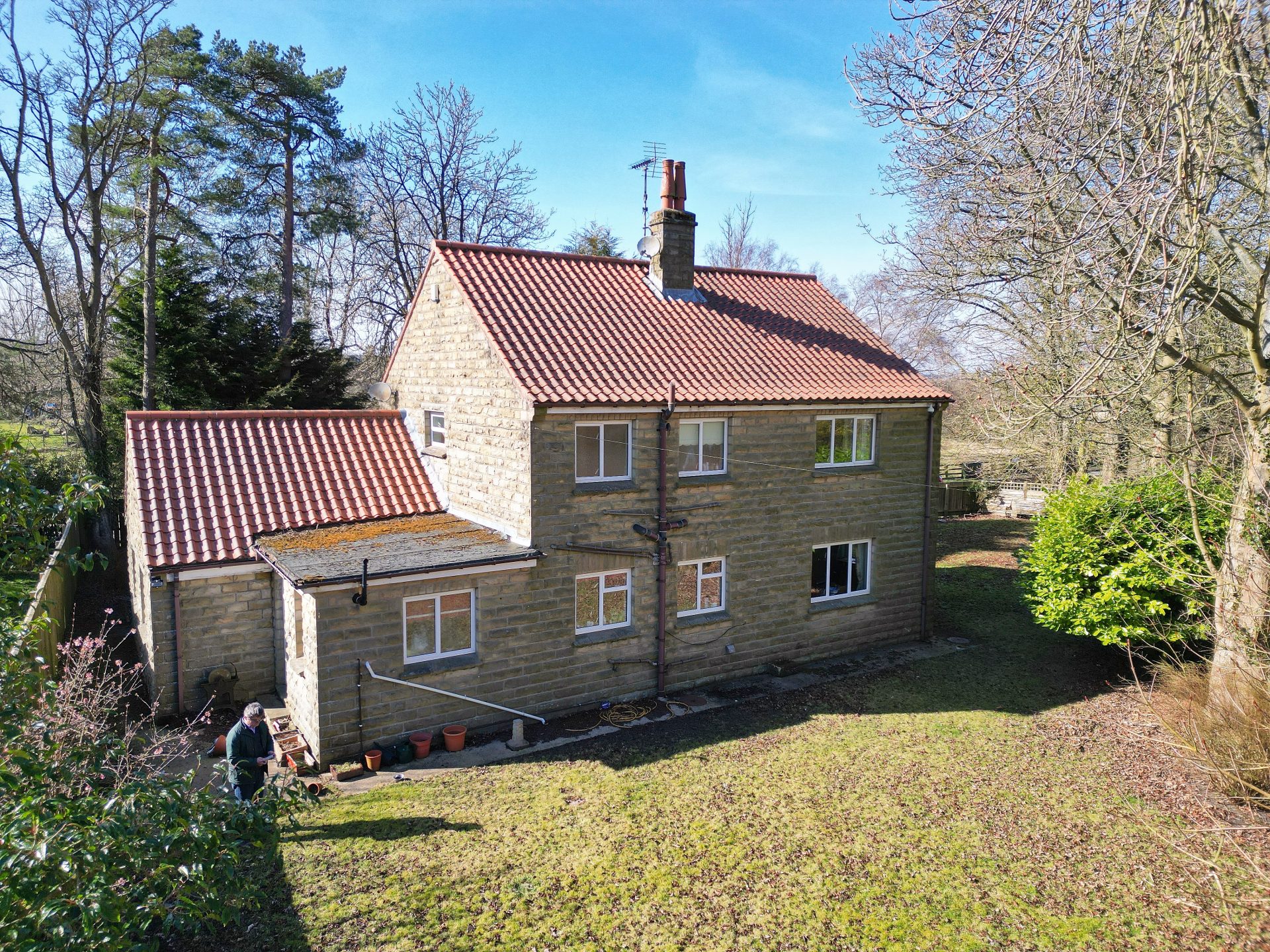 Set within a third of an acre surrounded by mature trees, this detached house with double garage has great potential to be improved and will make an excellent family home. The property is constructed from stone and has a traditional pan tiled roof, whilst outside there is a large lawned garden and ample parking. Inside there is a light-filled lounge with large windows and patio doors out to the garden. At the back of the property there is a dining room, a kitchen with fitted cabinets and a range cooker, and a utility room with plumbing for a washing machine. Upstairs there are four double bedrooms and two bathrooms with the principal bedroom having an en-suite shower room. The property has LPG gas central heating and double-glazing but would benefit from refurbishment throughout. There is great potential to extend the property to take full advantage of the size of the plot and create a large family home. The plot is triangular and enjoys privacy created by the mature trees that border the plot and the timber gated access. Located in the heart of this popular moors village that is well served by a Primary School, steam railway, village pubs and shops, whilst being surrounded by the moors and miles of trails for walking and biking for the outdoor enthusiast.