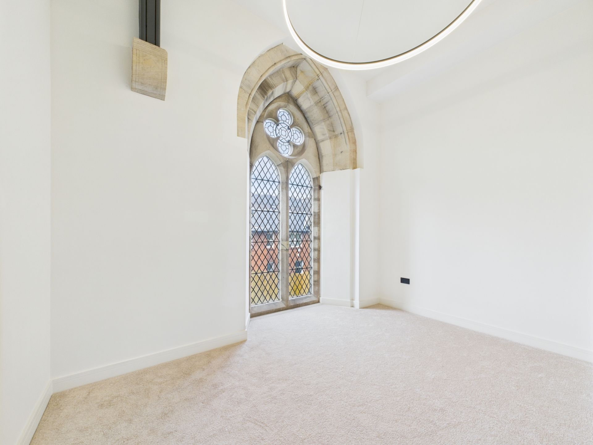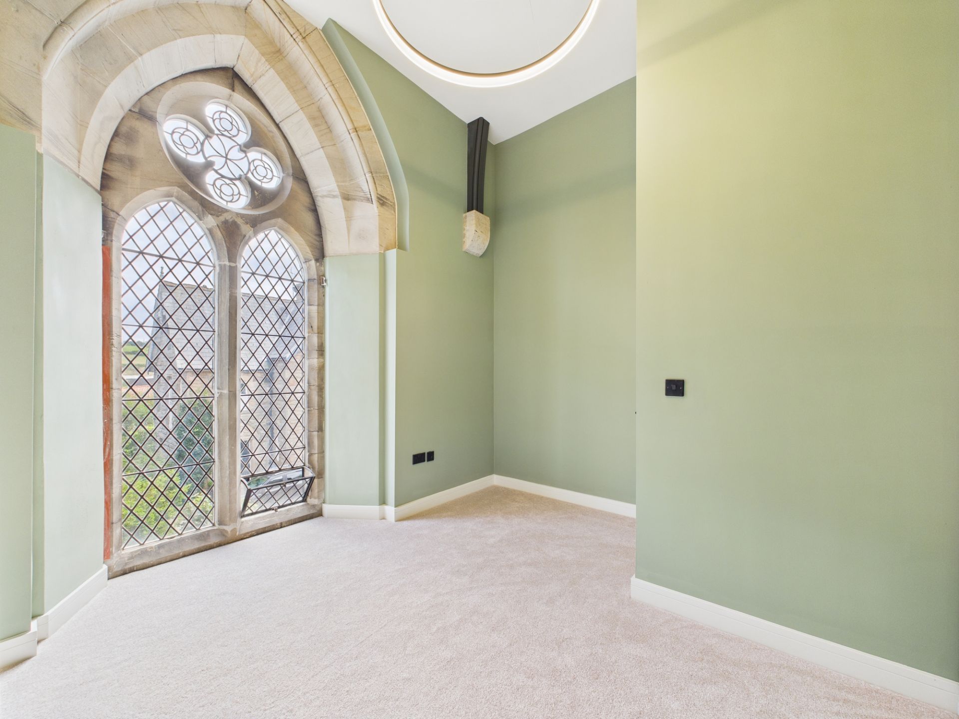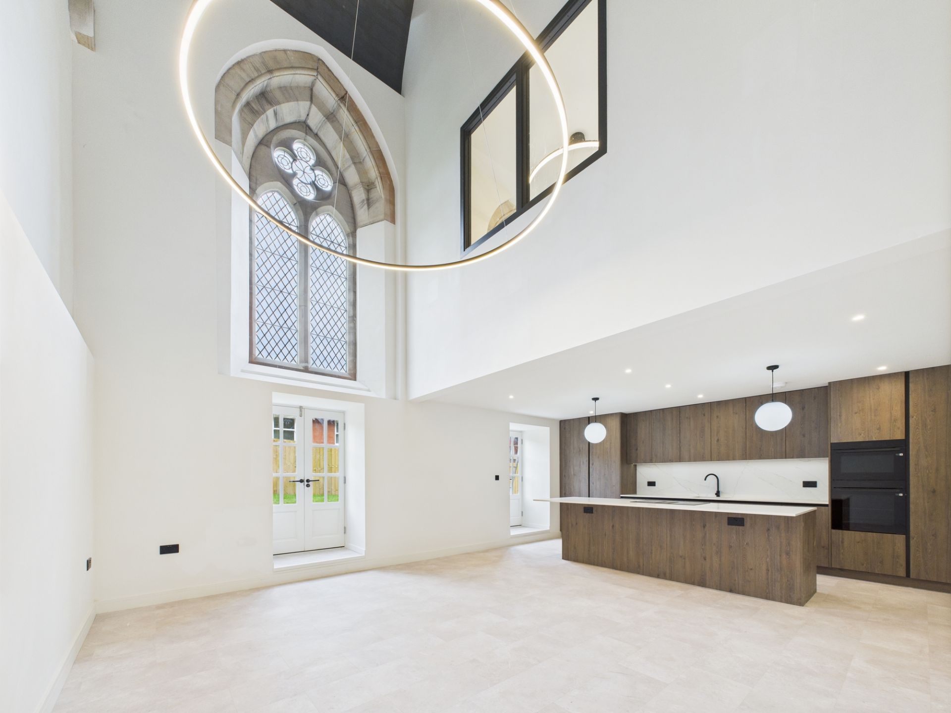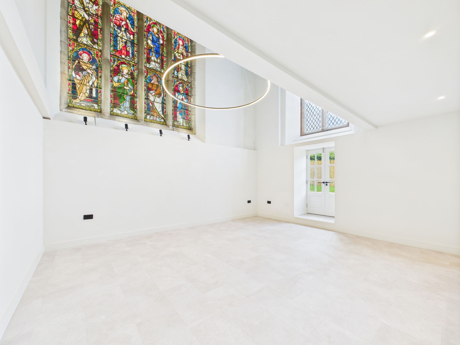 The heart of this remarkable home lies in its breathtaking open-plan living space, where soaring vaulted ceilings and magnificent full-height windows create an atmosphere of cathedral-like splendour. Original stained-glass windows cast jewelled light across the interior, while carved sandstone details serve as beautiful reminders of the building's sacred heritage.