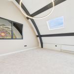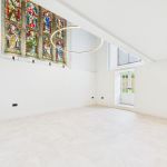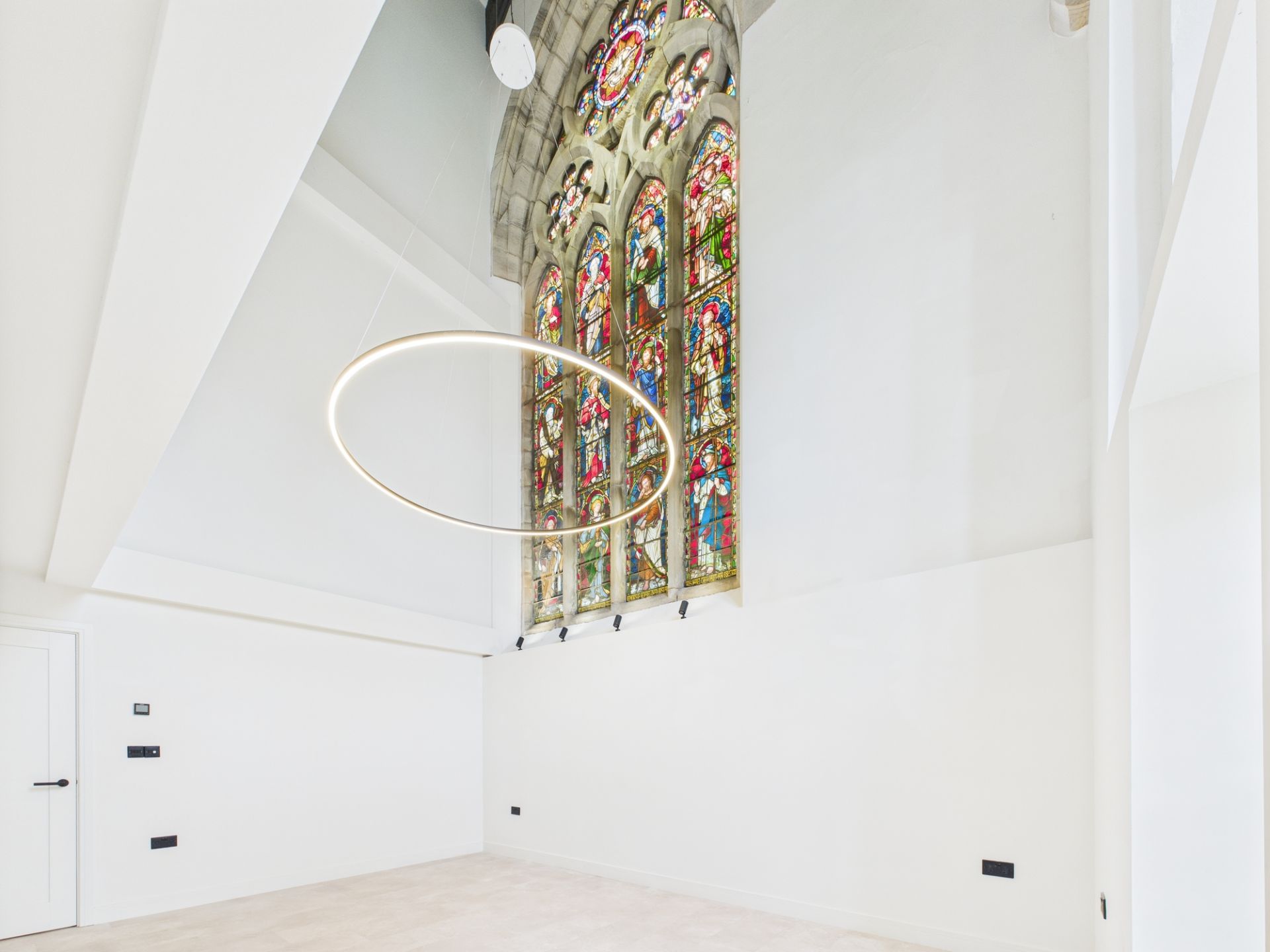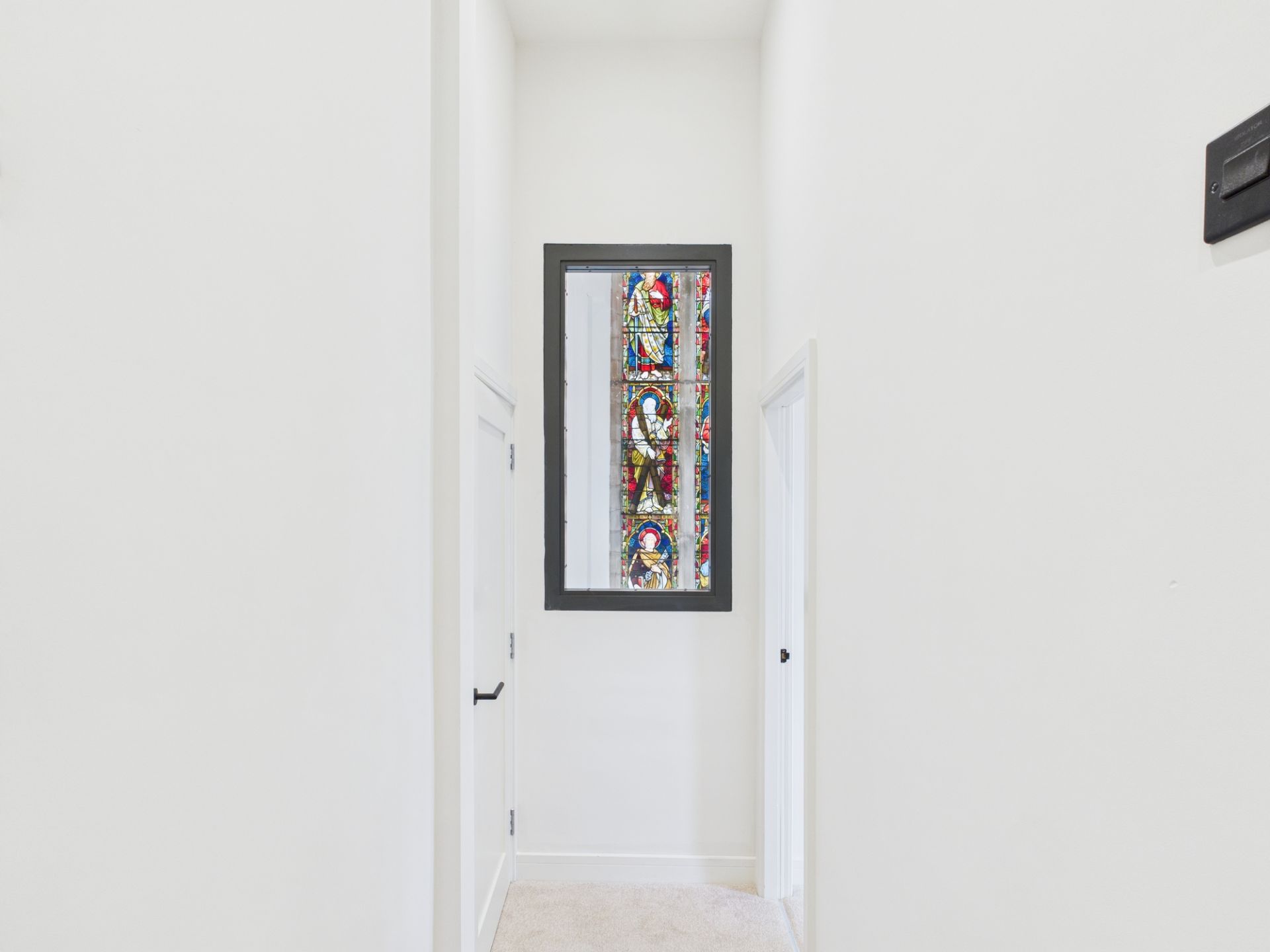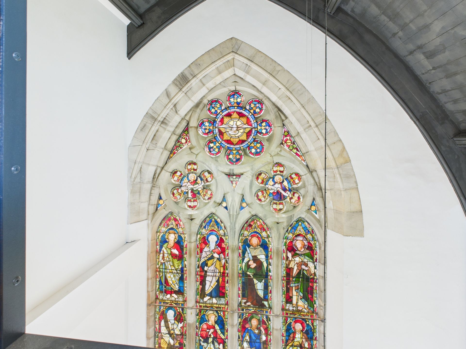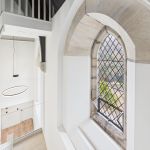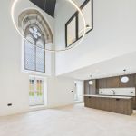 The heart of this remarkable home lies in its breathtaking open-plan living space, where soaring vaulted ceilings and magnificent full-height windows create an atmosphere of cathedral-like splendour. Original stained-glass windows cast jewelled light across the interior, while carved sandstone details serve as beautiful reminders of the building's sacred heritage.